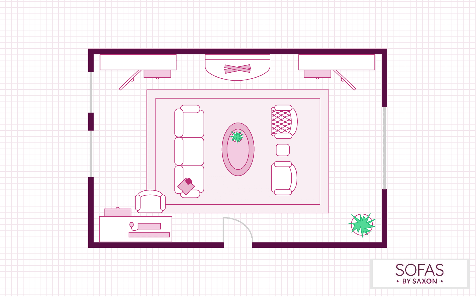 Similar to the above layout, this floorplan focuses on turning the living room into a social hub. Two sofas placed adjacent to each other will encourage conversation, while the addition of an extra armchair and footstool can ensure there are plenty of seating options for any occasion.