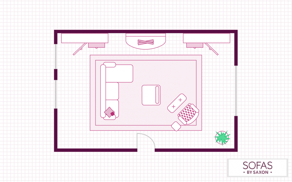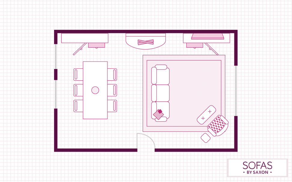 The layout of your living room doesn’t need to be bound to any restrictions, and this living room plan is testament to that. If you have a larger lounge with a lot of space, why not look at adding a dining area? You can use your furniture and rugs to define the different zones.