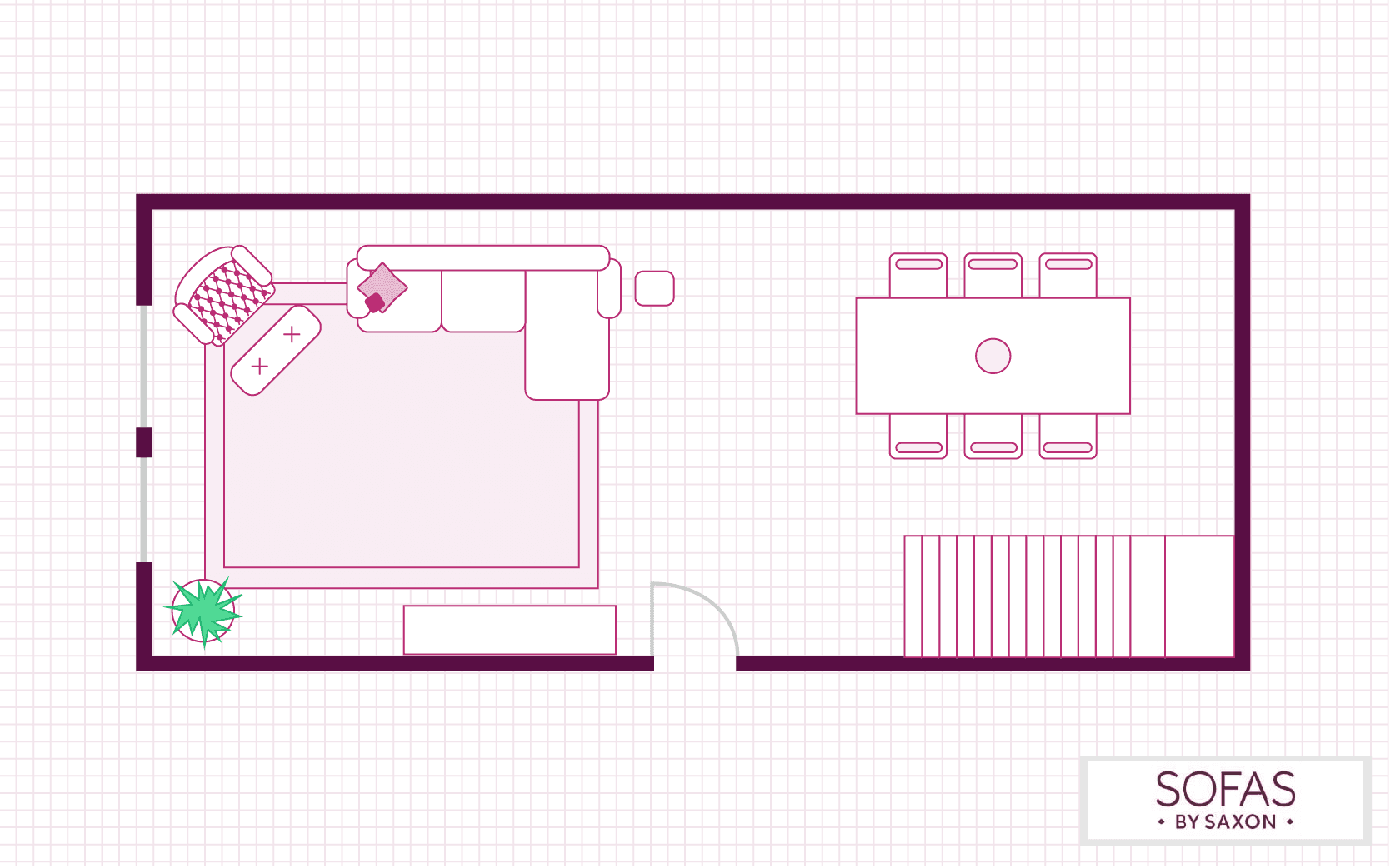 Similar to the above layout, this floorplan offers both a dining and entertainment space. However, they are more integrated, with a small side table being the only thing between the two. This makes it less separated and therefore a more sociable living room design.